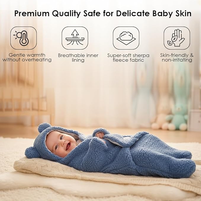 Crafted from gentle, baby-friendly fabric, it is soft on delicate skin while offering the right amount of warmth for everyday use. The attached hood adds extra comfort by keeping your baby’s head warm, making it ideal for naps, bedtime, outings, and travel.
